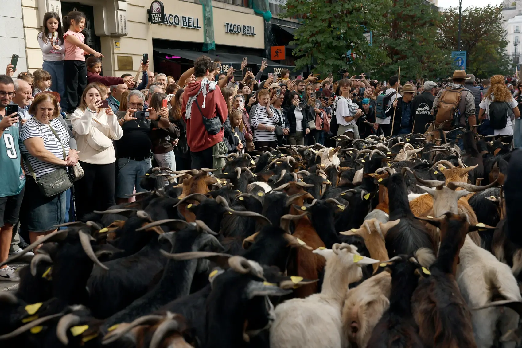 2025年10月19日,西班牙马德里迎来一年一度的游牧节,穿着传统服饰的牧羊人带领上千只羊穿越市中心的街道和广场,吸引大批民众和游客驻足观赏。(Oscar Del Pozo/AFP via Getty Images)