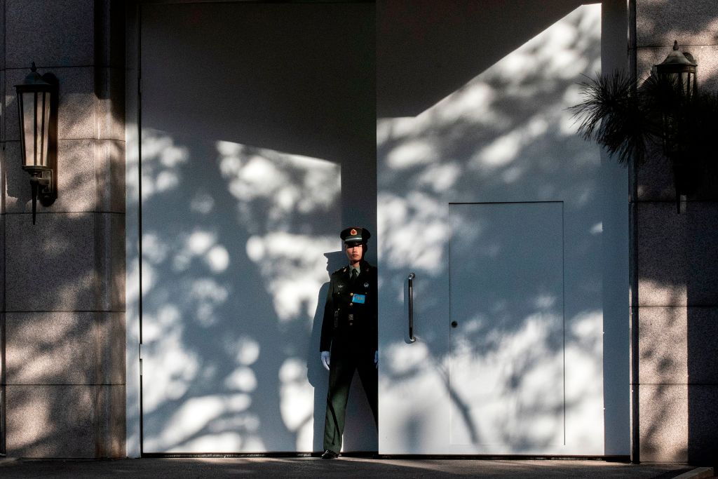 图为2019年中共四中全会期间,一名武警在京西宾馆大门外站岗。(NICOLAS ASFOURI/AFP via Getty Images)