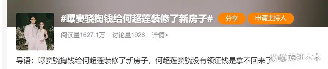 甚至有网友爆料,窦骁还给何超莲的新房子掏了装修费,而何超莲本人也爆料过,婚礼是全部由新郎包办,自己什么都没管,因此婚变传出来之后,外界纷纷认为豪门家族太抠门。