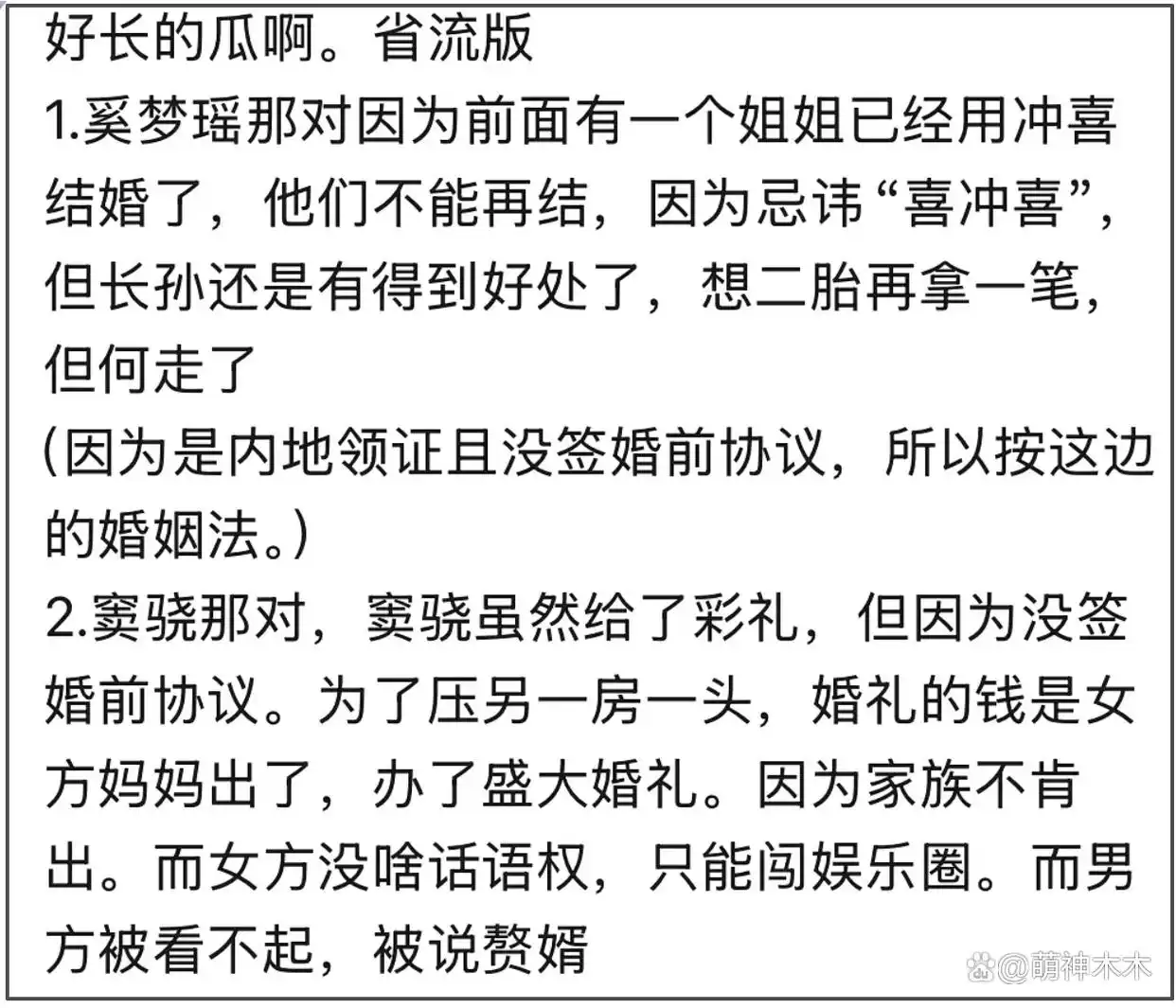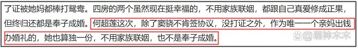 如今又有了新的爆料,婚礼并非窦骁出资,而是何超莲的妈妈,也就是三太,为了压四房一头,所以出资给何超莲办了盛大的婚礼,但是因为窦骁不肯签婚前协议,所以两人至今没领证。