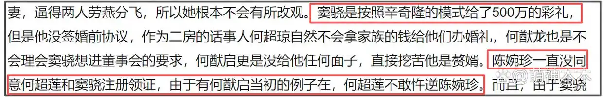 虽然窦骁也按照何超盈老公的做法,给了500万彩礼,但是他不肯签署婚前协议,所以三太陈婉珍就一直不同意两人领证,何超莲自己处境也很尴尬,至今没能凭借家族联姻或者生孩子,拿到更多实际利益或者进入家族企业,更别提窦骁了。