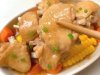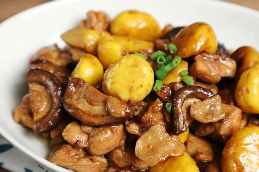 4、倒些热水进去,焖半个小时,板栗下锅,补点盐,同其炒匀后继续焖二十分钟,充分熟透且入味,马上出锅。