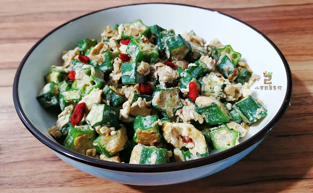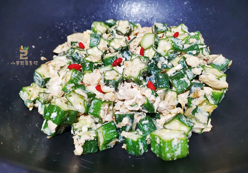 4、起锅放油,加点葱花,香味烹出来,秋葵倒里边,翻炒几下,把蛋液淋到锅底,其包裹到秋葵周围,一边翻炒一边凝固,最后炒到全部凝固,秋葵也彻底熟透,抓一把枸杞撒进去,届时关火装盘。