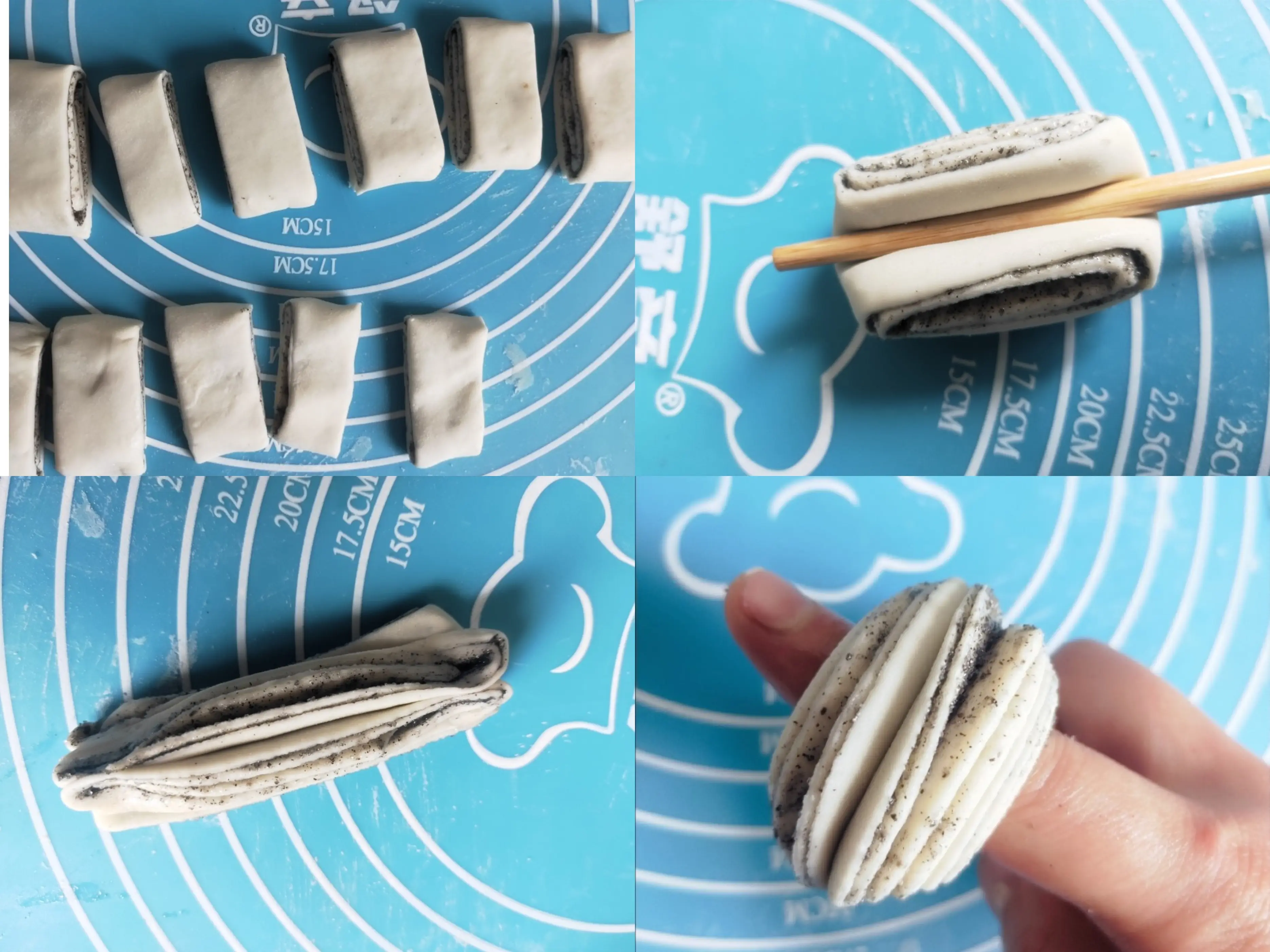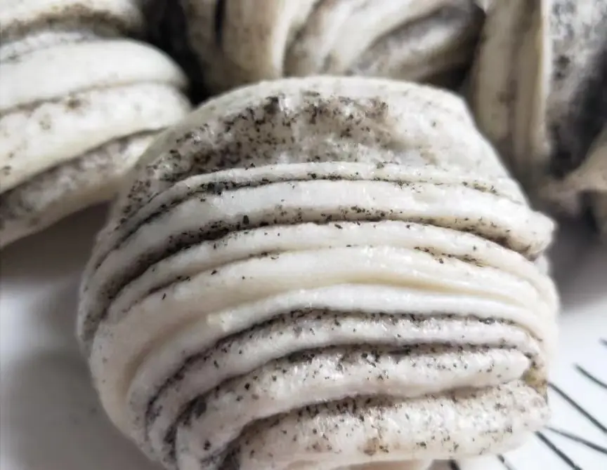 3、简单揉一揉,主要是为了避免粘手,然后擀薄。把黑芝麻馅抹到表面,卷起来后,切成5公分左右宽度的小段。筷子在中间用力一压,再把两头捏住转个圈,就做好造型了。