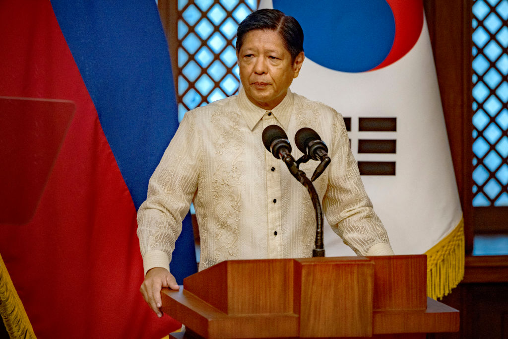 图为2024年10月7日,菲律宾总统小马科斯(Ferdinand Marcos)在马尼拉南宫与韩国总统尹锡悦会面时发表演讲。(Ezra Acayan/POOL/AFP via Getty Images)