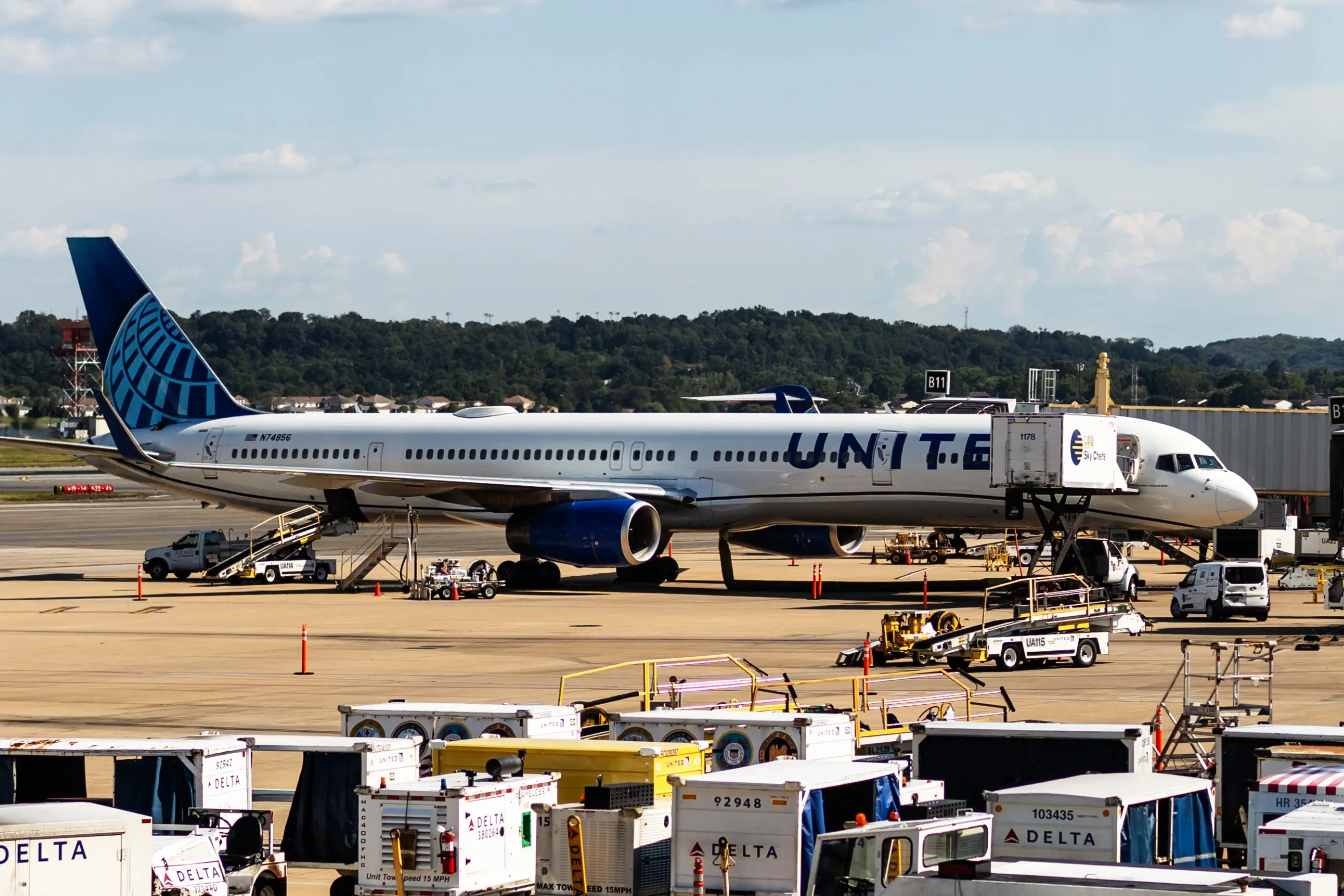 图为示意图。2025年9月13日,一架美联航的飞机停于华盛顿罗纳德‧里根国际机场。(Madalina Kilroy/大.纪.元;)