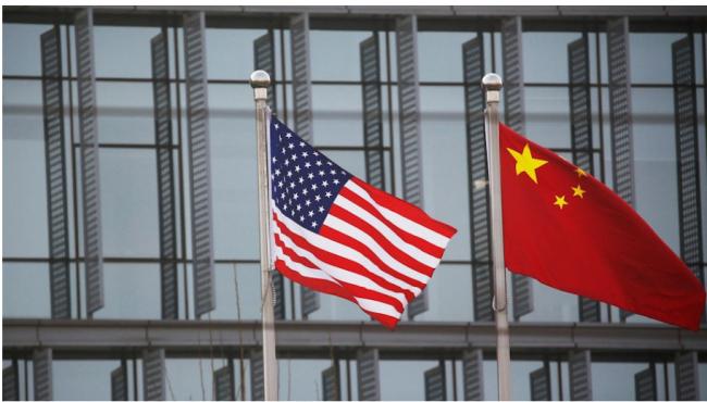 中美关系・中美贸易・中美芯片战・中美国旗:2021年1月21日,中国北京一间美国企业大楼外有中美两国国旗随风飘扬。(Reuters)