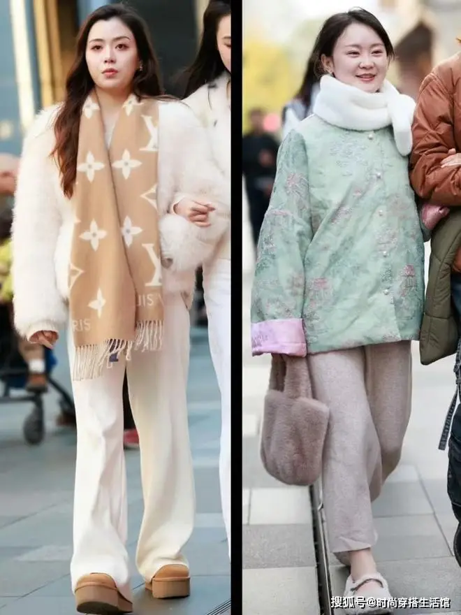 奶奶裤虽然舒适保暖,但整体版型上不会很厚重,即便搭配略显蓬松的羽绒服也不会显得臃肿。如果是小个子女生的话,建议穿奶奶裤搭配短款羽绒度,强调腰线位置,划分上下身材,塑造完美的三七分比例,视觉上更显高。