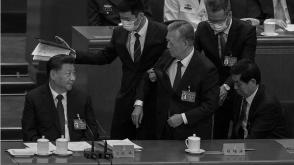 2022年中共二十大会议上,胡锦涛被公然架走。(图片来源:公有领域今涛拍暗)