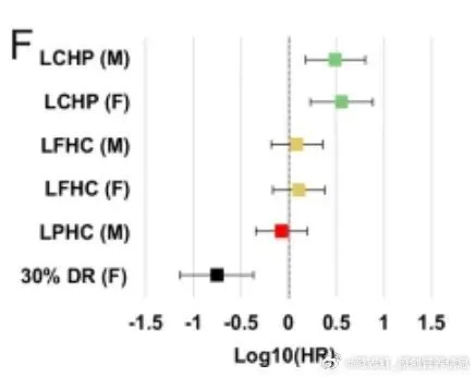 一点都不令人意外:低碳水高蛋白(LCHP)的组死得最早,低脂肪高碳水(LFHC)的组活得最长。(图1,左边是雄性小鼠的寿命图,右边是雌性小鼠的寿命图。线条最靠右的,就是最长寿的组。)