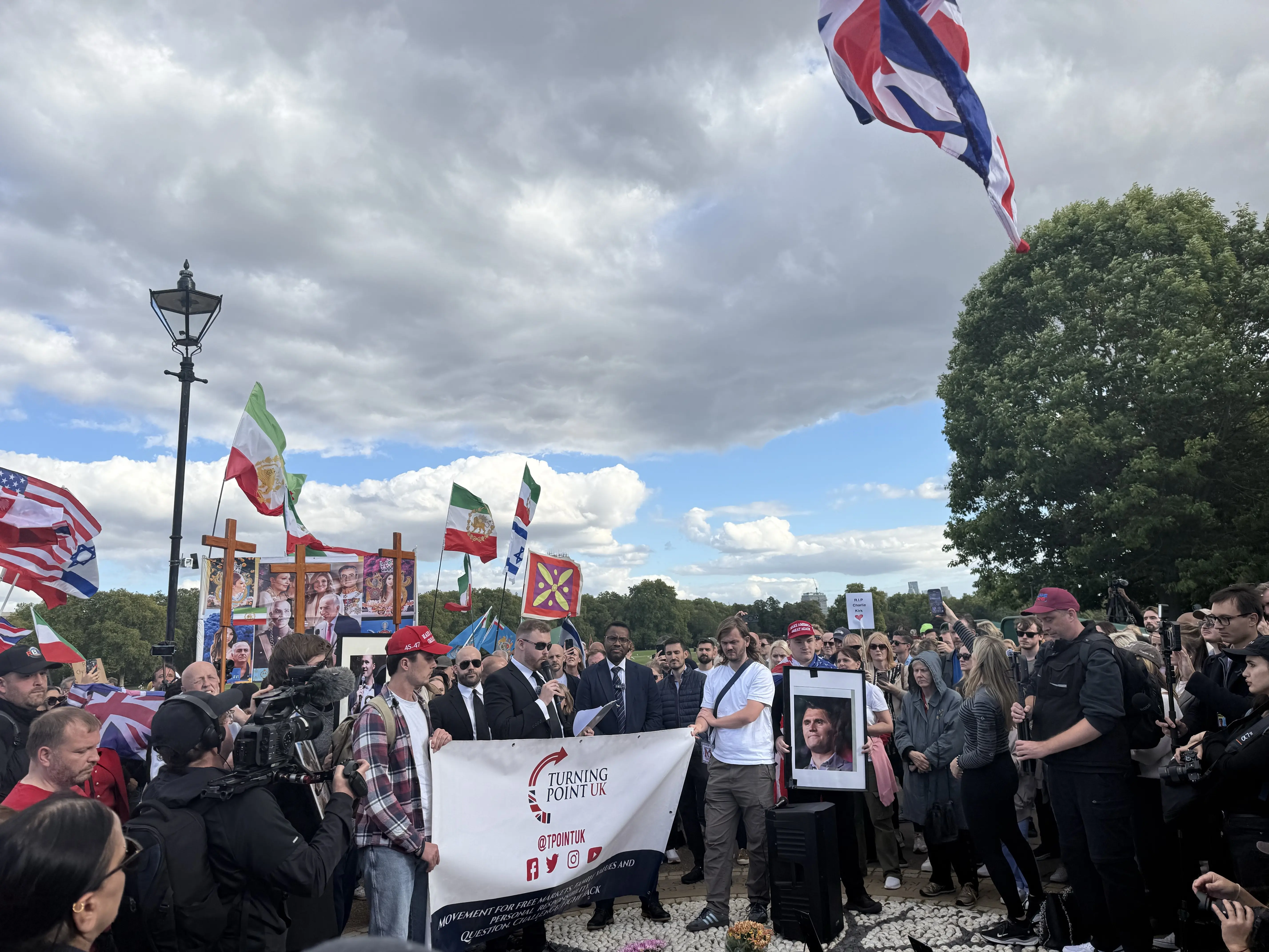 2025年9月21日下午3点,英国各地人士在伦敦海德公园聚集,为不久前遇刺身亡的美国知名保守派活动家查理‧柯克(Charlie Kirk)举办悼念活动。(吴旖丽/大.纪.元;)