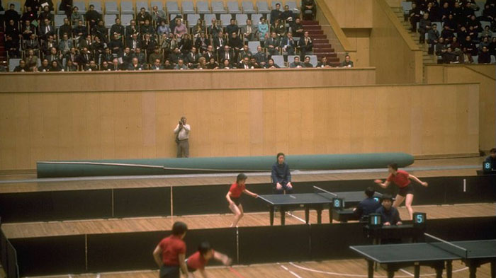 真不知道尼克松当时是什么感觉,“中国人有点意思,挺会演戏的”。紧接着是体育表演。太具体的记不清了,只记得有乒乓球、羽毛球等。印象最深的是体态臃肿的庄则栋和张燮林打了一场,不怎么精彩。当然还有其他有名运动员的表演,无论精彩与否观众报以的掌声都非常热烈。