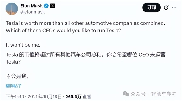对此,马斯克的回应很直接,他回怼道:“特斯拉的市值比所有其他汽车公司的总和还要高。你希望哪位CEO来执掌?我可不会。”