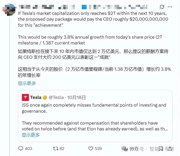 当然,支持者也大有人在。特斯拉官方账号已发文呼吁股东投票赞成,头号“铁粉”“木头姐”凯茜·伍德也预测,该方案将像2018年那样以压倒性优势通过。