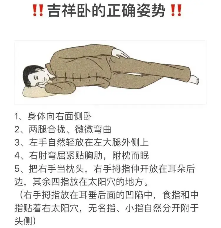 什么是吉祥卧呢?吉祥卧就是身体向右面侧卧,两腿合拢、微微弯曲,右手拇指压着耳后,左手轻放在左大腿外侧上。