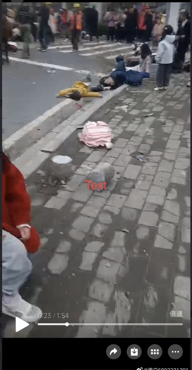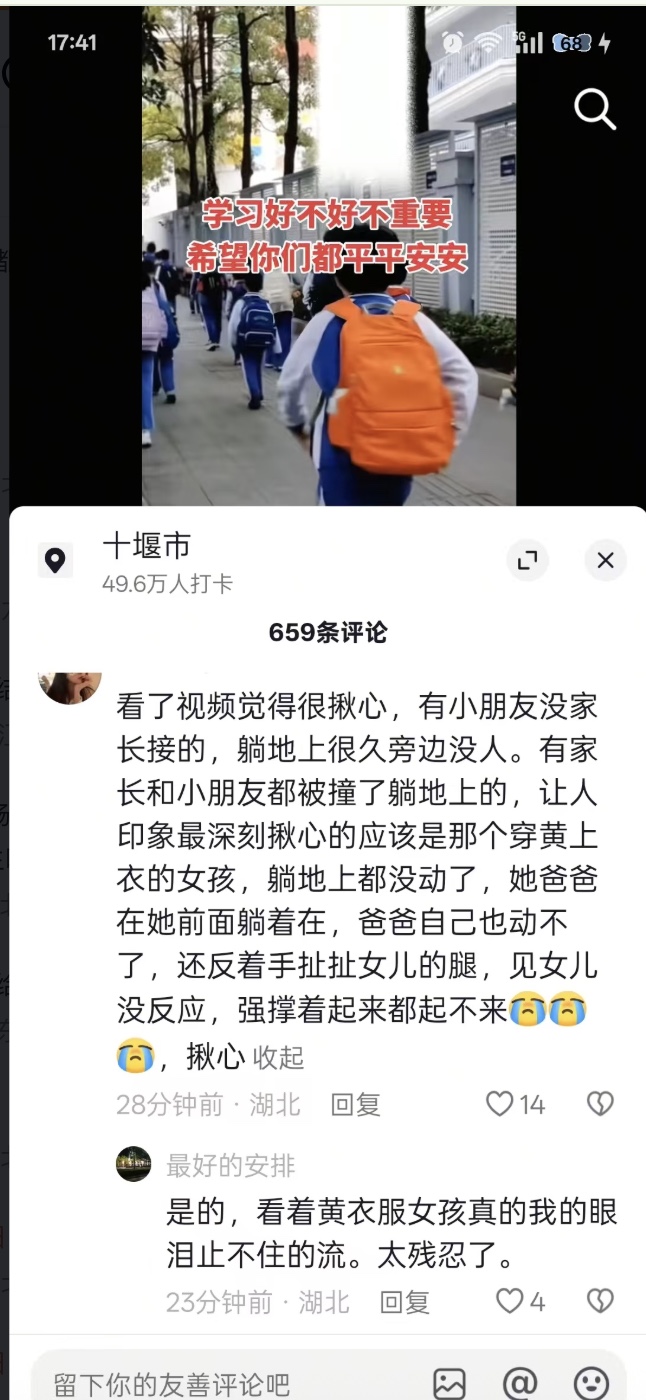 有网友说,“看了视频很揪心,有小朋友没家长接的,躺地上很久旁边没人管。有家长和小朋友都被撞了躺地上的。最让人揪心的是那个穿黄上衣的女孩,躺地上都没动了,她爸爸在她前面躺着,爸爸自己也动不了,还反手扯扯女儿的腿,见女儿没反应,强撑着起来都起不来。”