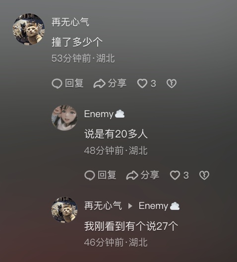 “我看视频是一辆车行车记录仪,时间是17点29分左右,没有亮刹车灯,直接撞向人群,然后地上,感觉看着不太行的就好几个,太惨了,不知道撞了多少人,但是肯定不下十人,这种人建议凌迟处死。”“看视频确实撞飞了二十多个,倒在地上不动的就十几个,都是小孩子,太可怜了”。