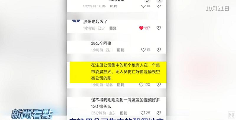 山东胶州在本月14日曾发生大火,有知情人士透露,在注册公司集中的地方有人放火,无人员伤亡,“好像是销毁空壳公司的帐”。图:翻摄自新闻看点YT频道
