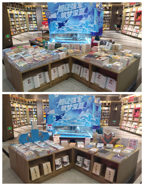 图为大陆某地新华书店,上图为习*近*平书籍展位,下图被替换成《明朝那些事儿》和《毛泽东选集》。(知情人提供)