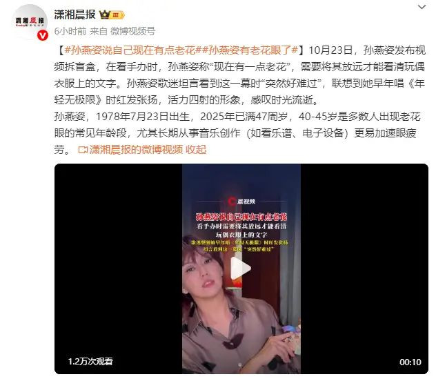 10月23日,孙燕姿发布视频拆盲盒,在看手办时,孙燕姿称“现在有一点老花”,需要将其放远才能看清玩偶衣服上的文字。孙燕姿歌迷坦言看到这一幕时“突然好难过”,联想到她早年唱《年轻无极限》时红发张扬,活力四射的形象,感叹时光流逝。