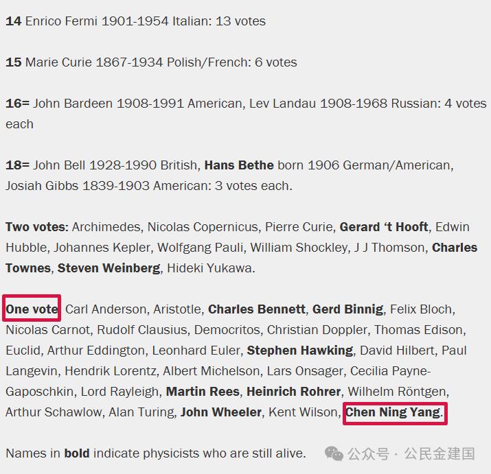 在收到的大约130份回复中,前十分别是:爱因斯坦119票,牛顿96票,麦克斯韦67票,波尔47票,海森堡30票,伽利略27票,费曼23票,狄拉克、薛定谔22票,卢瑟福20票,玻尔兹曼、法拉第、普朗克16票,而杨振宁等29人仅各得一票。