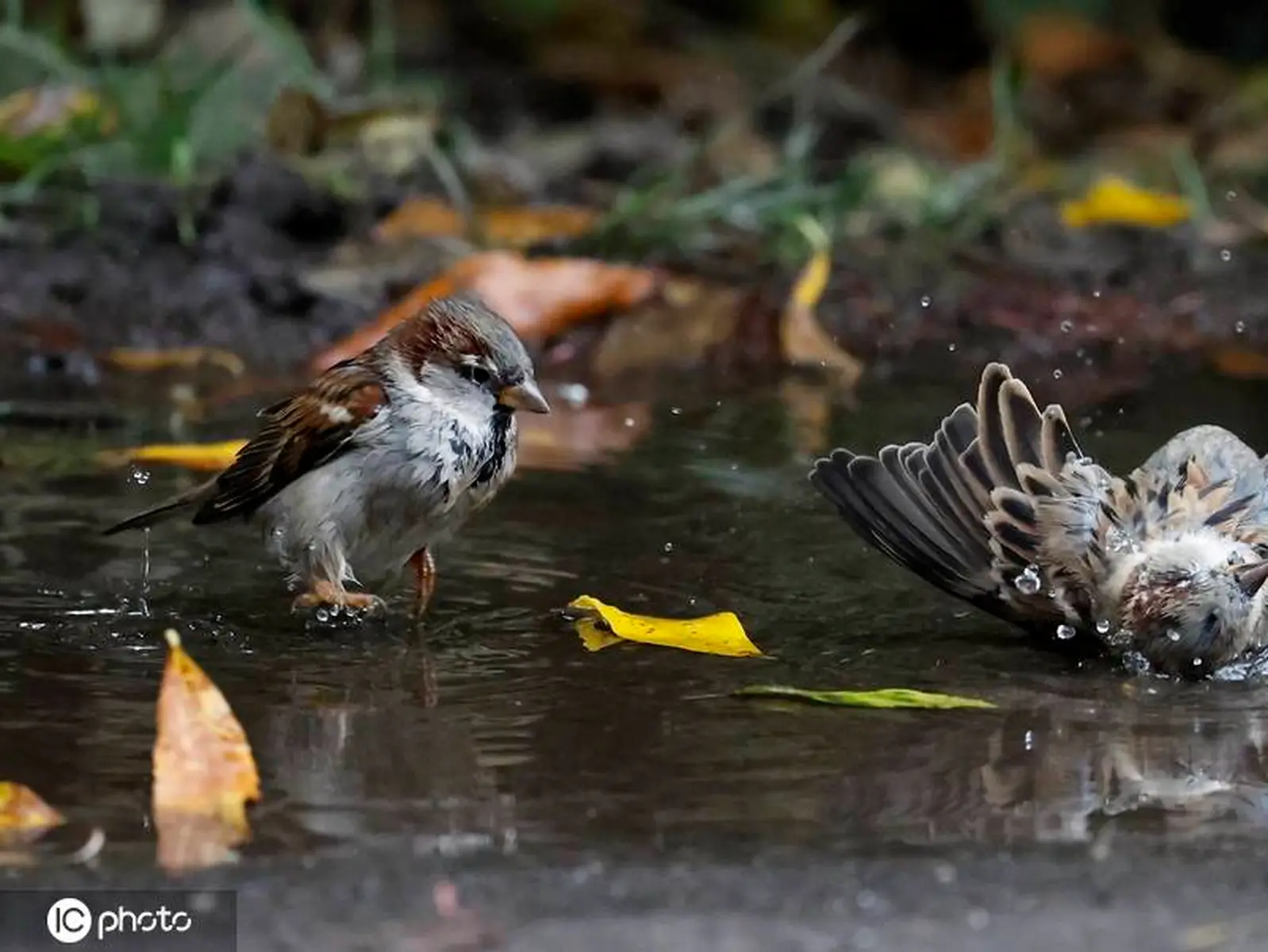 当地时间2025年10月15日,罗马尼亚布加勒斯特,两只野生麻雀在泰坦公园积满秋叶的水坑中嬉戏。