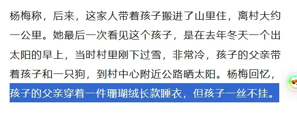 不要说孩子在地上吃东西了,野人孩子连衣服也穿不暖,去年冬天刚下过雪,就有人看到孩子父亲穿着珊瑚绒长款睡衣,孩子却一丝不挂。