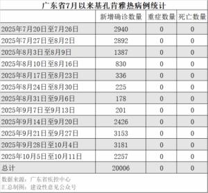 自2025年7月20日至10月11日,广东省已累计确诊基孔肯雅热病例20006例,无重症或死亡病例。