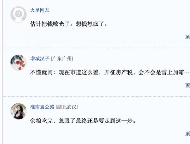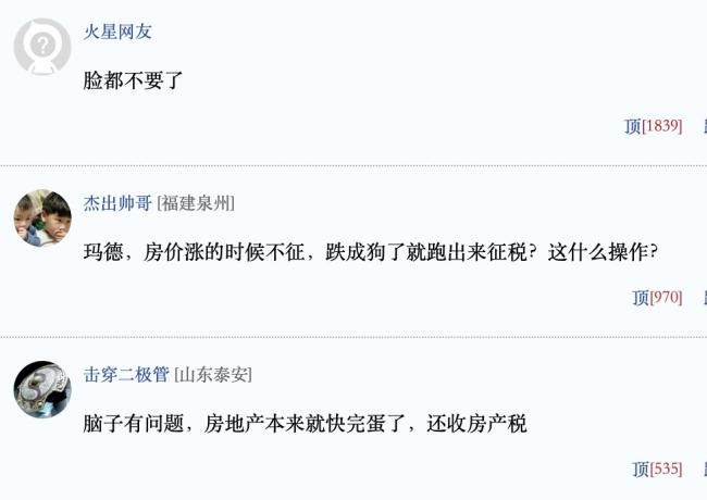 该消息引发网友一片骂声:“脸都不要了”,“玛德,房价涨的时候不征,跌成狗了就跑出来征税?这什么操作?”“脑子有问题,房地产本来就快完蛋了,还收房产税”、“估计把钱败光了。想钱想疯了”、“穷极了,脸一捂屁股都不要了”、“只差不公开抢了”。