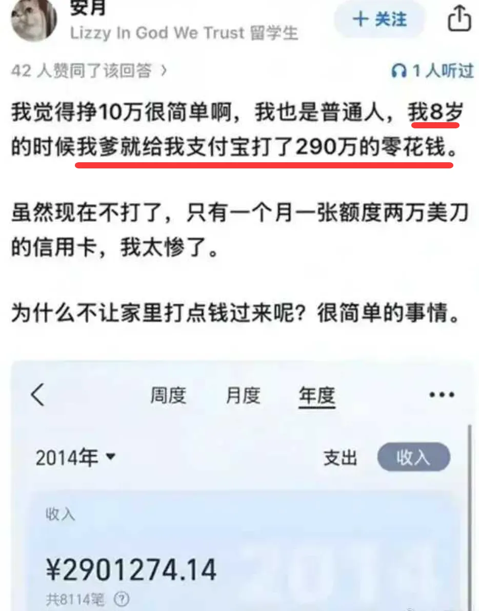 这位女留学生表示,自己在8岁的时候,她爸爸就给她打了290万,而且这钱还是她的“零花钱”而已。而她现在有一张每月两万美元的信用卡(相当于每月就有14万的人民币“零花钱”)。