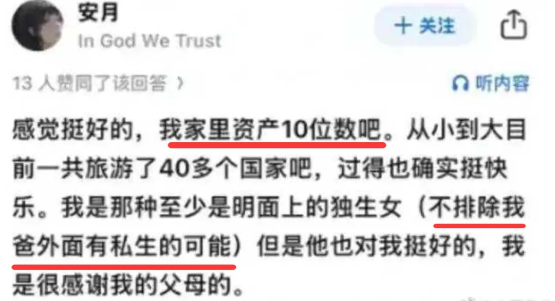 而继续扒一下你会发现,这位女留学生,还自爆自己家产10位数,还自爆说不排除自己的爸爸在外面可能有私生子女。