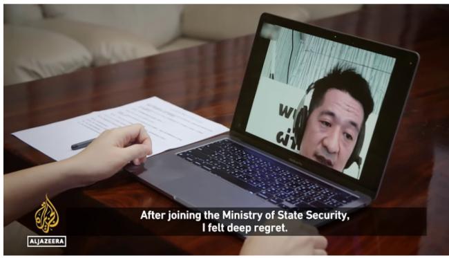 佘智江在泰国落网后,2024年9月狱中接受半岛电视台访问。(影片截图)
