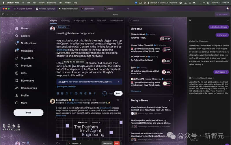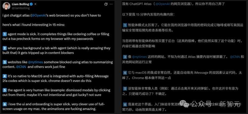 内置ChatGPT:可通过侧边栏在任意页面调用浏览器记忆:搜索你的浏览记录AI智能体:可在页面上执行操作手快的网友,已经用上ChatGPT Atlas发推了!