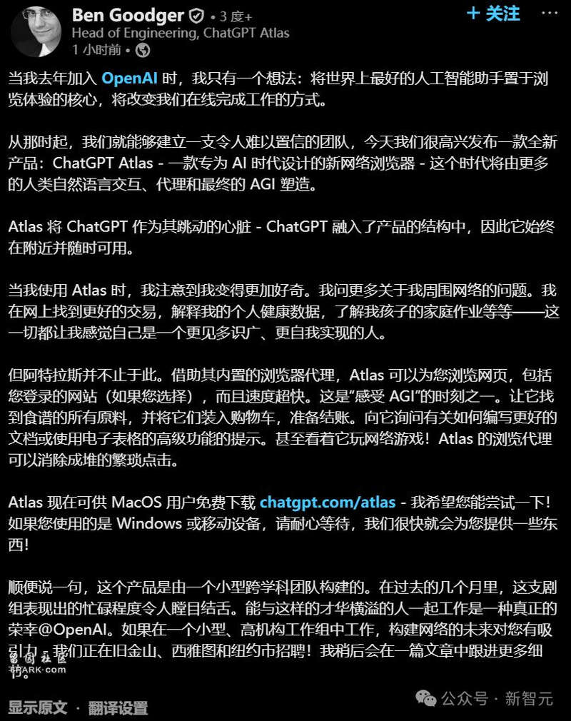 而如今ChatGPT Atlas经过一年半的孕育终于付梓,他难掩喜悦,招聘广告也接踵而至。