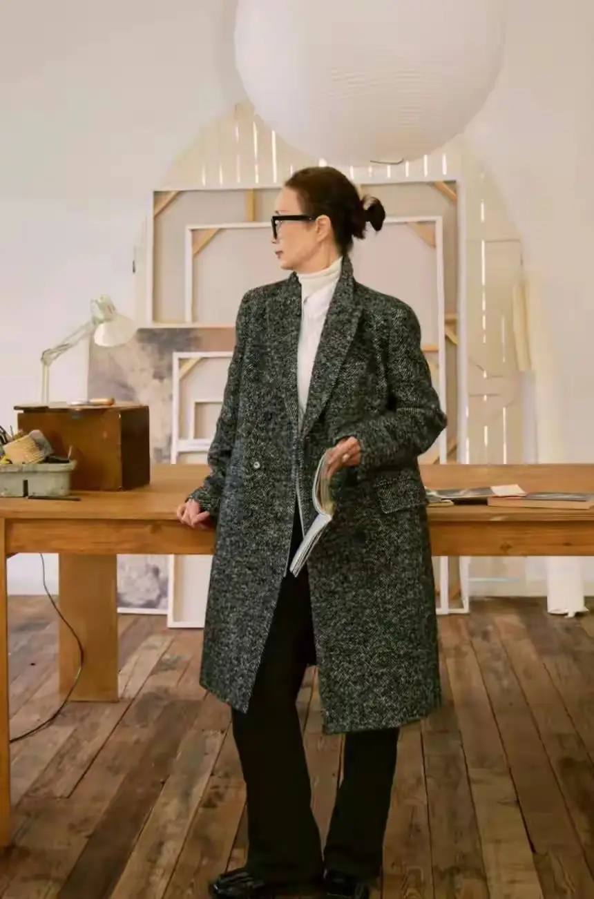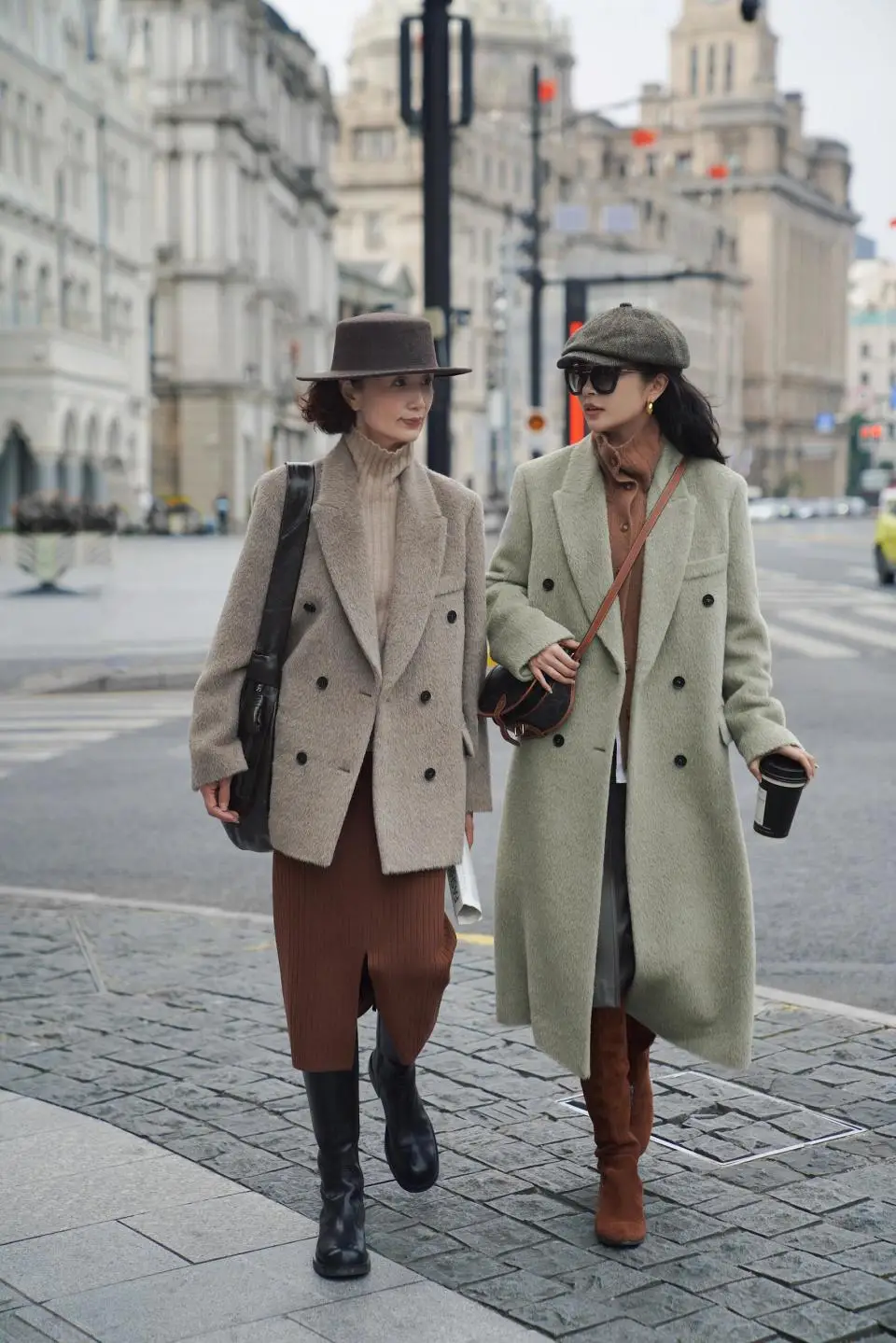 中年女性,我们直接选择一件浅驼色的大衣外套,内搭深棕色的薄款打底衫,下半身选一条天生就拥有时尚元素的格纹半身裙,脚上穿的是一双棕色的中筒靴和内搭的衣服,色彩相对应,这样整体的色彩搭配就会变得更协调,保暖的同时又优雅得体。