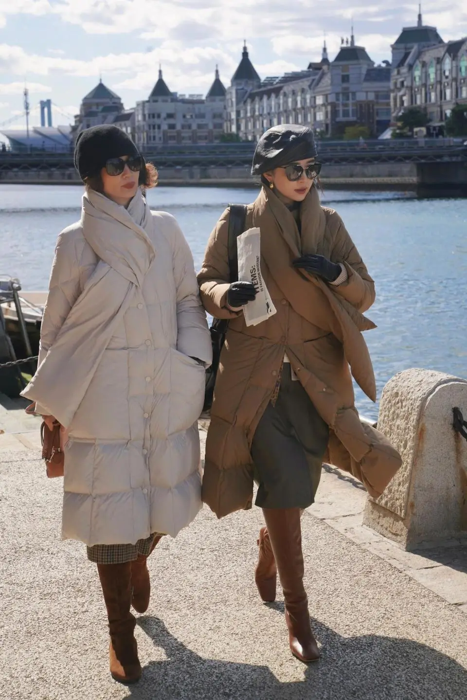 当然,你还可以选择长款的羽绒服外套,不过选择羽绒服外套的时候,千万不要过于蓬松,这样的话会显得过于臃肿,选择下面这种大格纹走线设计的羽绒服最佳,直接搭配一条直筒半身裙和中筒靴就够。