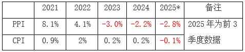 再看居民消费价格指数(CPI)和工业生产者出厂价格指数(PPI)。在全球高通胀背景下,2021年和2022年中国的PPI分别为8.1%、4.1%,但从2022年10月起,呈现收缩态势,至2025年9月已经连续连续第36个月负增长。而CPI,2021和2022年因物资供应遭疫情冲击,尚分别达到0.9%和2%,但2023年疫情消退之后,就骤降了,2025年前三季度甚至是负数。