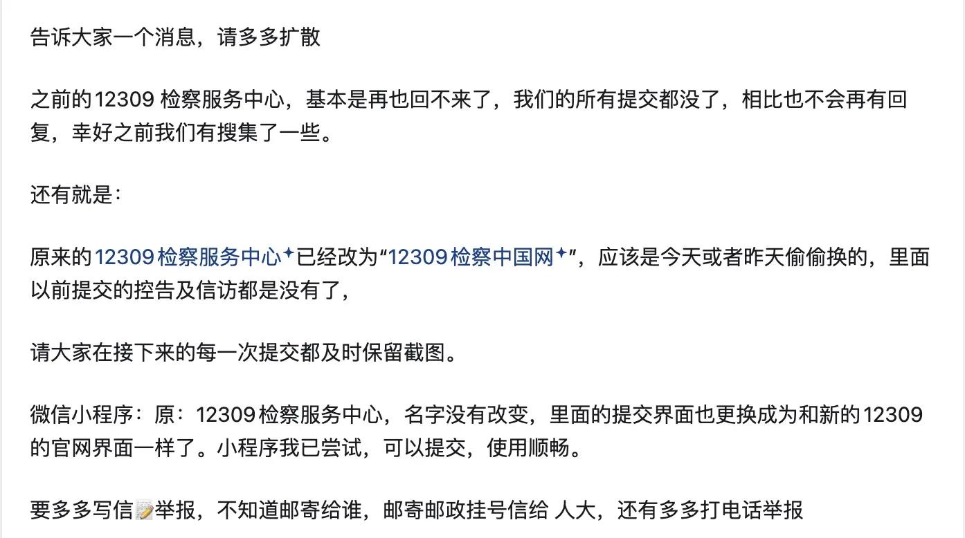 该网友说,“之前的12309检察服务中心,基本是再也回不来了,我们的所有提交都没了,相比(想必)也不会再有回复”。