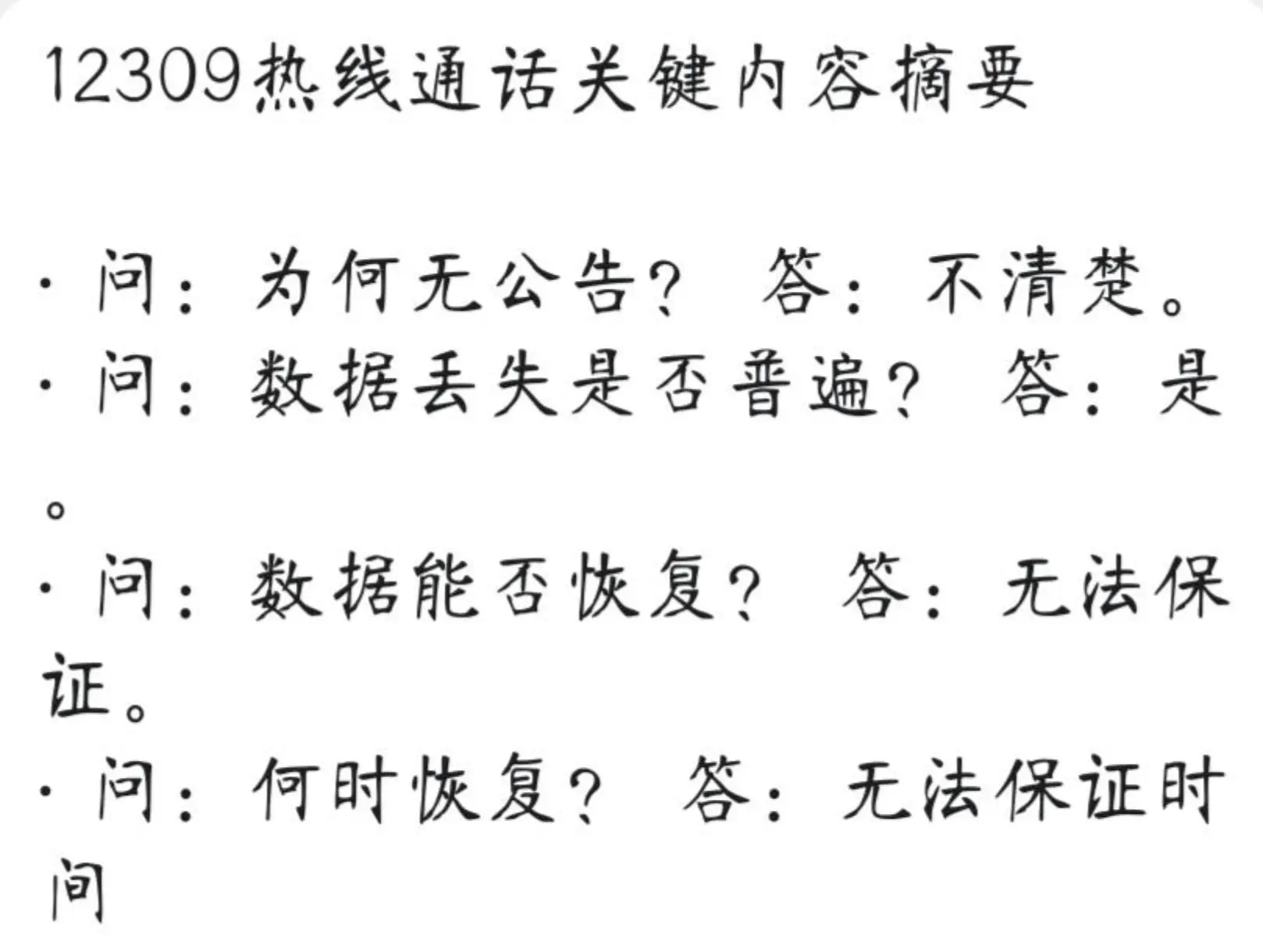 另一网友在评论区透露,自己打了12309热线询问结果,问“为何无公告”,对方回答,“不清楚”,问“数据丢失是否普遍”,对方回答“是”,“无法保证恢复”。