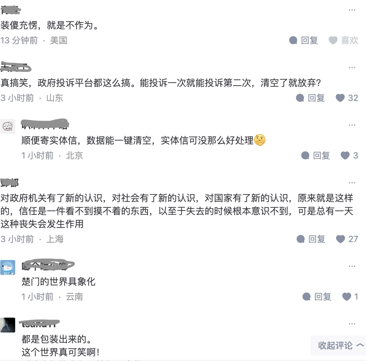 网友批评,“真搞笑,政府投诉平台都这么搞。能投诉一次就能投诉第二次,清空了就放弃?”“楚门的世界具象化”、“政府平台还能这么玩?”“三观一再被刷新”、“还能这样?也太不要脸了”。