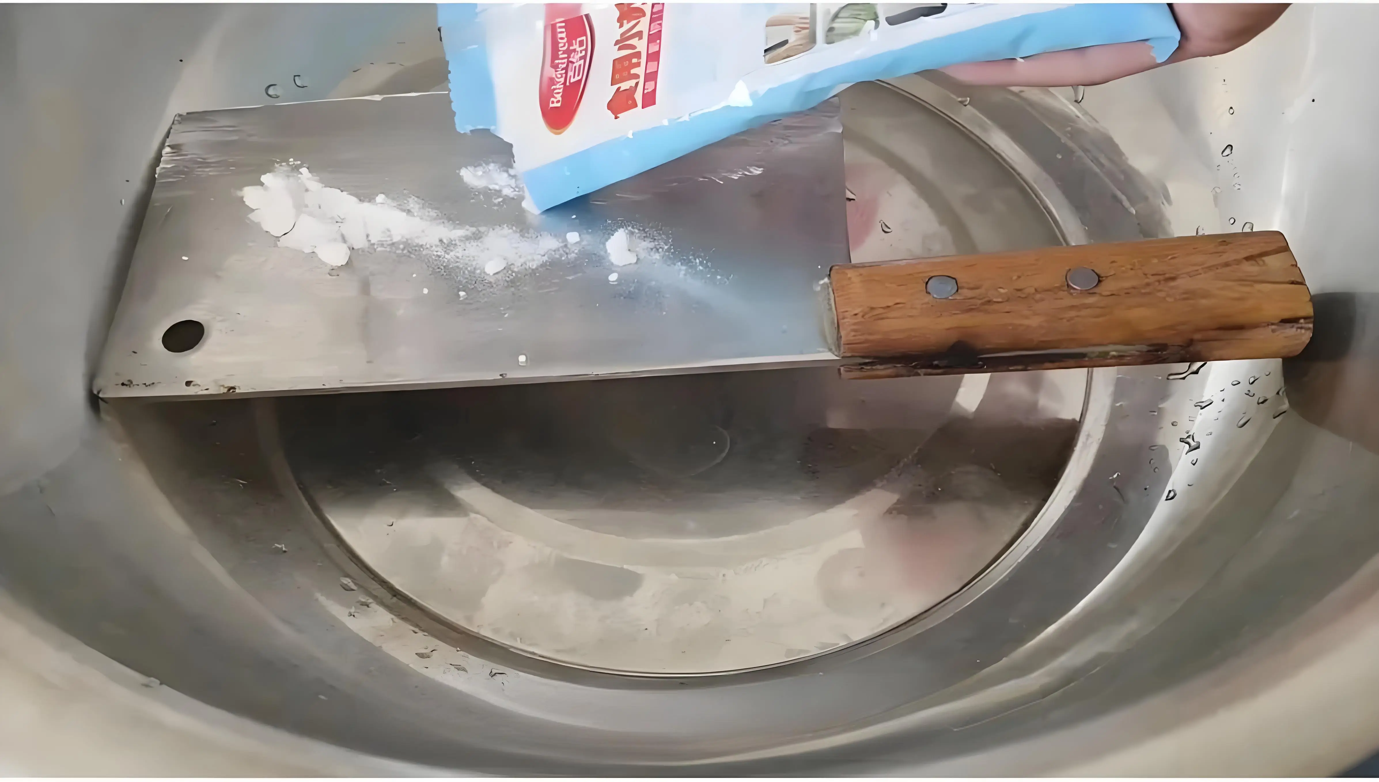 刷洗完以后,再用清水冲洗干净就可以了,这时候你就会发现,菜刀上面的油污、锈迹全没了,整个菜刀变得非常光亮。