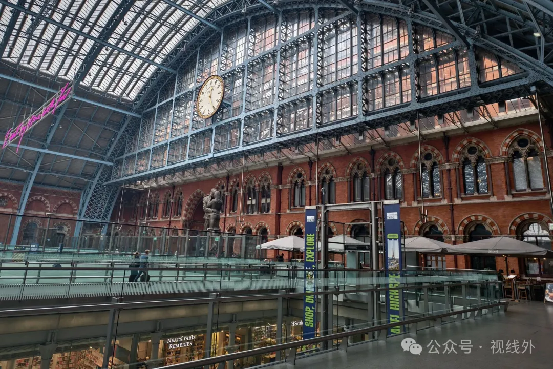 白天的圣潘克拉斯车站内部,楼上一层人流较少,楼下一层是欧洲之星到达层,人流密集/作者拍摄,2025