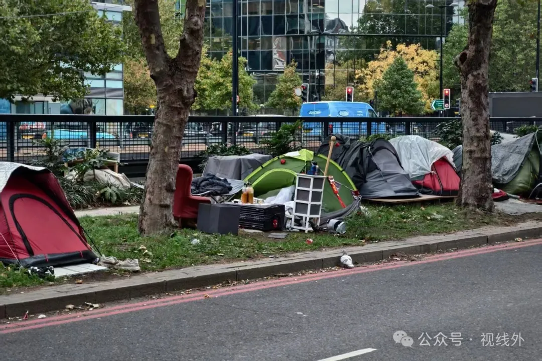 圣潘克拉斯站附近尤斯顿路(Euston Rd.)绿化带上的流浪者聚集区/作者拍摄,2025