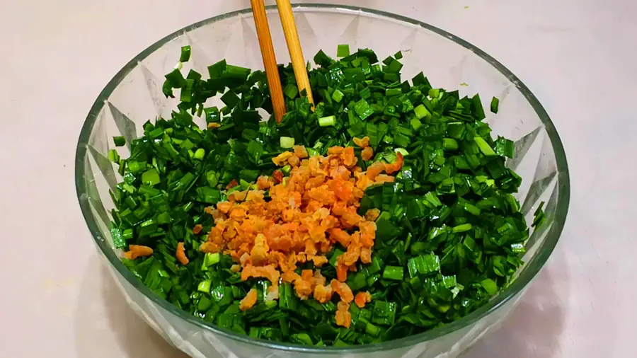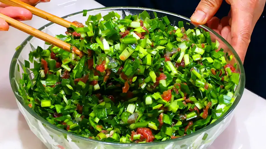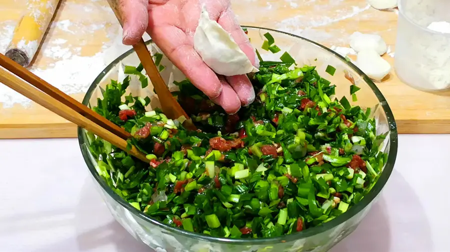 很多朋友直接把韭菜和盐拌在一起,这是不对的!这样韭菜会被盐刹出汤,饺子馅稀得没法包,一煮还爱破皮。切记,先加香油拌匀,再放盐!