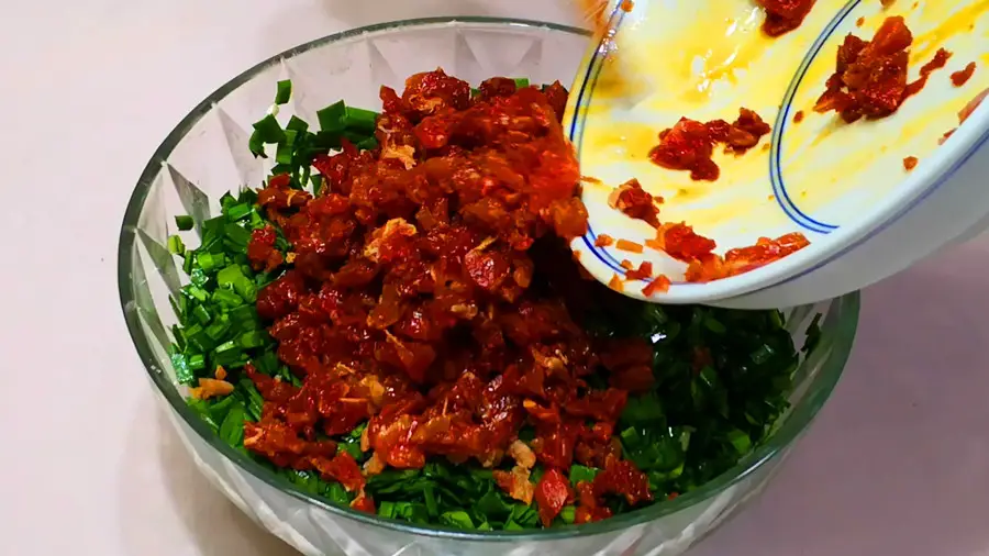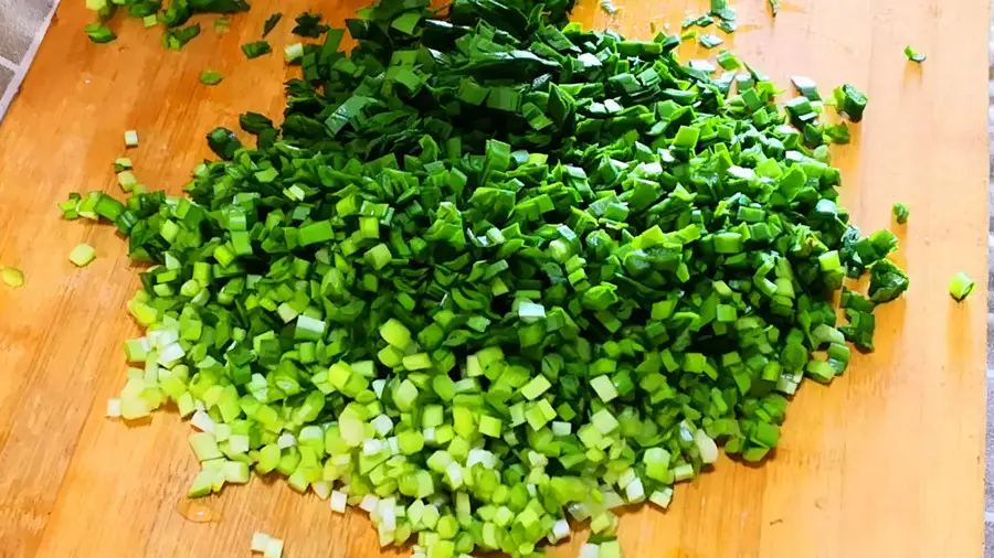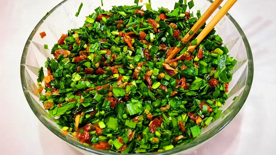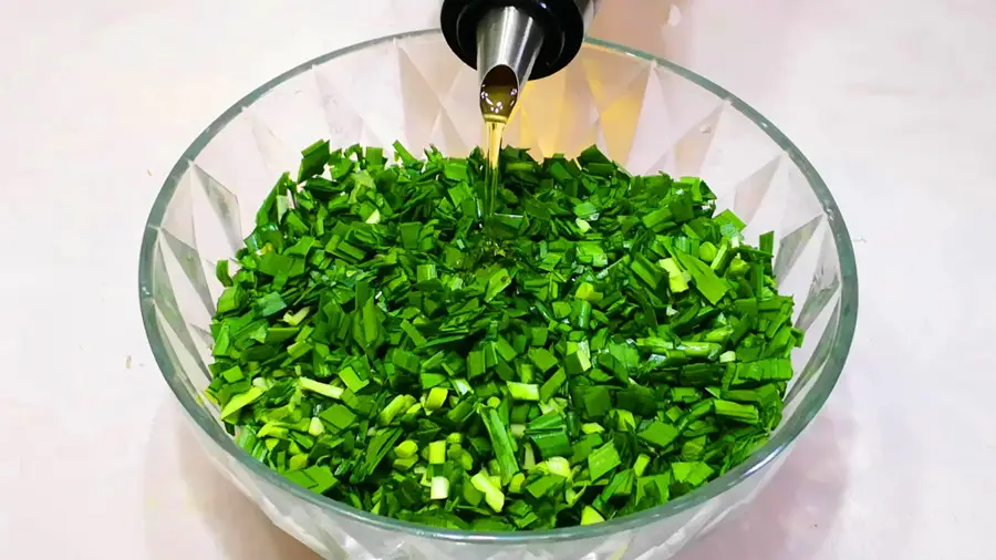 1.先放香油:韭菜切好后先拌上一勺食用。这一步很关键,香油能在韭菜的表面形成一层保护膜,让韭菜变得油亮翠绿,既防止韭菜出水,又能增加鲜香味。