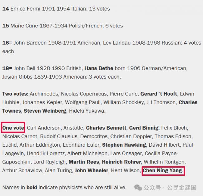 在收到的大约130份回复中,前十分别是:爱因斯坦119票,牛顿96票,麦克斯韦67票,波尔47票,海森堡30票,伽利略27票,费曼23票,狄拉克、薛定谔22票,卢瑟福20票,玻尔兹曼、法拉第、普朗克16票,而杨振宁等29人仅各得一票。