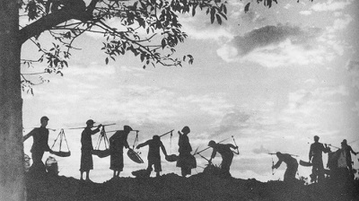 于是我们列队来到成都老西门外,这时才发现还有其他学校的学生,干部及市民之类的人,站了许多人在“夹道欢迎”。还有几十个青年妇女扭秧歌,打腰鼓,场面盛大而热闹。不一会,乡下的农民大挑、小挑,还有用川西平原最方便的手推独轮车(农民叫它为“鸡公车”)推着粮食进城来了。这时锣鼓喧天,鞭炮齐鸣,外加鼓掌,呼口号,像欢迎什么英雄似的。我们那个政治辅导员,用个铁皮制成的话筒,带领我们高喊口号:“增加生产最光荣,卖余粮给国家更光荣,光荣上面加光荣,我们大家来欢迎!”于是口号声此伏彼起“欢迎,欢迎!”“农民弟兄最光荣!”这些一年四季“面朝黄土背朝天”的乡下人,哪里被人如此“尊敬”过?所以一时真有点受宠若惊。特别有个中年男子,推着装有粮米的“鸡公车”,几乎开小跑似的边跑边喊“加油啊!毛主席的社会主义马上就要来了!”我们那位辅导员立即高喊“向这位农民同志学习、向他致敬……”