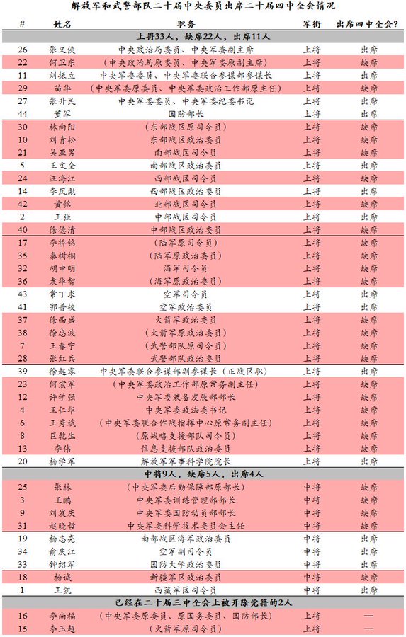 这次四中全会共递补了11名中央委员。也有人盘点发现,候补中央委员名单中,有多达8人排名靠前,本应依序进入这11名递补名单,结果却被“跳过”。这8人中,竟有5人是军方将领。