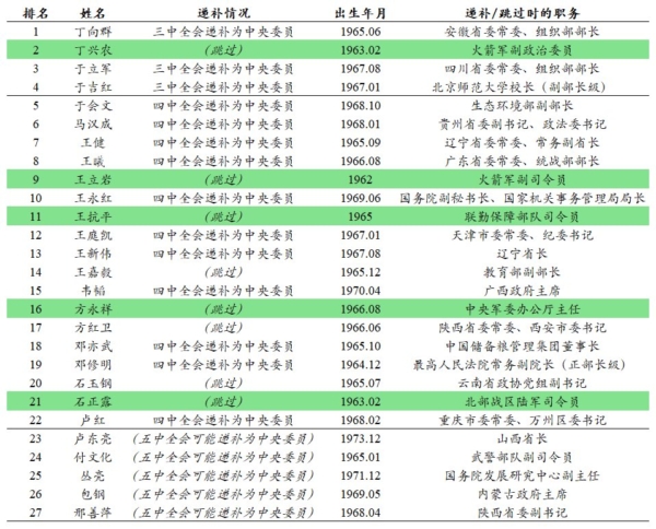 中共四中全会被递补中央委员的候补委员及被“跳过”的候补委员名单。(网络图片)