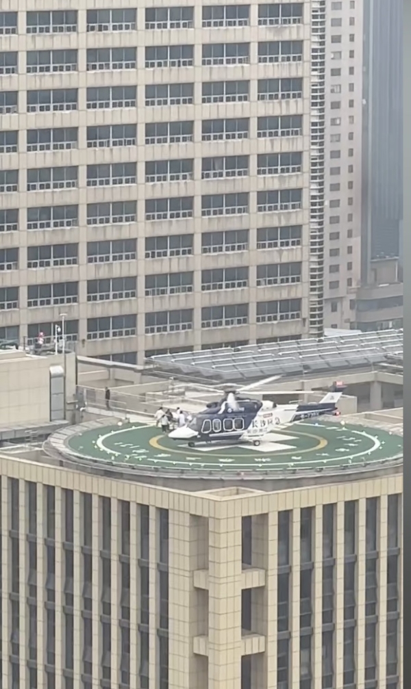 照片显示,在该医院一栋大楼的楼顶,建有一个绿色的圆形直升机停机坪,并有直升机降落,还有医护人员运送担架下飞机。